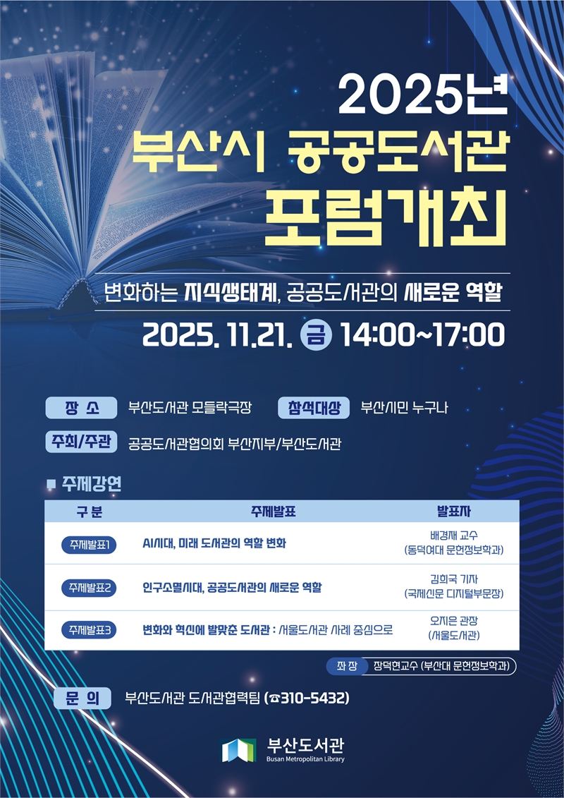 [더코리아저널 김종섭 기자] 부산도서관은 개관 5주년을 맞아 오는 11월 21일 오후 2시 도서관 지하 1층 모들락극장에서 「2025 부산시 공공도서관 포럼」을 개최한다.이번 포럼은 공공도서관협의회 부산지부가 주최하고 부산도서관이 주관한다. 빠르게 변화하는 정보환경 속에서 공공도서관이 나아가야 할 방향을 모색하고, 도서관 간 교류와 협력을 강화하기 위해 마