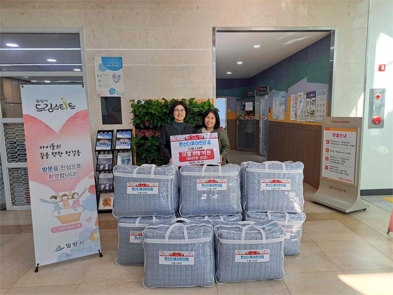 [더코리아저널 박현상 기자] 한신더휴 어린이집(원장 김미숙)은 27일 밀양시 드림스타트를 방문해 취약계층 아동에게 전달해 달라며 80만원 상당의 이불 8채를 기탁했다.이번에 기탁한 이불은 어린이집에서 개최한 ‘한신사랑나눔 바자회’를 통해 마련된 것으로, 가정에서 사용하지 않는 장난감, 책, 의류 등의 물품을 모아 원아와