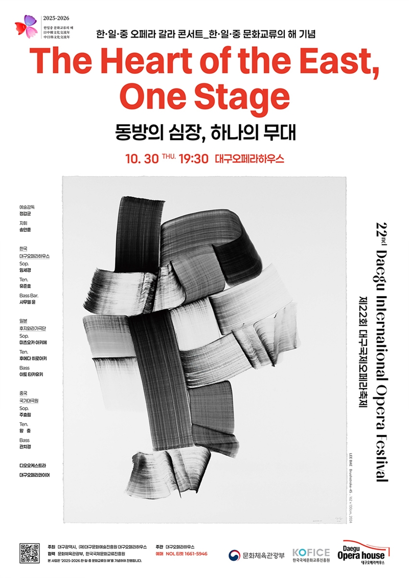 [더코리아저널 박태주 기자] (재)대구문화예술진흥원 대구오페라하우스(관장 정갑균, 이하 ‘대구오페라하우스’)는 오는 10월 30일(목) 오후 7시 30분, 제22회 대구국제오페라축제의 특별 공연으로 ‘2025 한·일·중 오페라 갈라 콘서트 – 동방의 심장, 하나의 무대’를 선보인다.2025-2026 한·일·중 상호문화교류