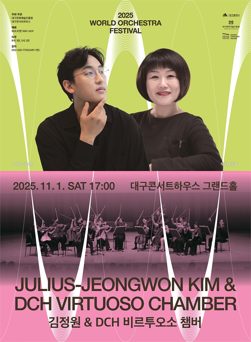 [더코리아저널 박태주 기자] ‘김정원 & DCH 비르투오소 챔버’가 11월 1일(토) 오후 5시, 대구콘서트하우스 그랜드홀에서 열리는 ‘2025 월드오케스트라페스티벌’ 무대에 오른다.이번 공연은 클래식의 전통 위에 현대적 감성을 더한 특별한 무대로, 스타 피아니스트 김정원과 대구콘서트하우스가 지역의 대표 연주자들을 중심으