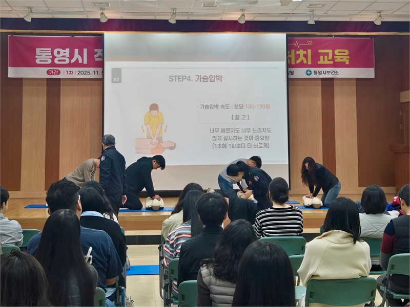 [더코리아저널 박현상 기자] 통영시(시장 천영기)는 지난 5일과 오는 7일(금), 12월 11일(목) 3일간 시청 직원 230여명을 대상으로 통영소방서와 연계해 심폐소생술 등 응급처치 교육을 실시하고 있다.이번 교육은 대민행정 서비스 최일선에서 발생할 수 있는 응급상황에 대비, 시민 안전과 생명보호를 위해 직원들의 응급