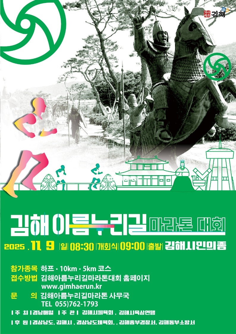 [더코리아저널 박현상 기자] 김해의 대표적인 수변 산책로인 해반천을 따라 달리는 ‘2025 김해 아름누리길 전국 마라톤대회’가 오는 9일 김해시민의 종 광장 일원에서 열린다.대회는 오전 8시 30분 개회식을 시작으로 9시부터 하프, 10km, 5km 부문 참가자들이 10분 간격을 두고 출발한다. 이번 대회는 경남매일이