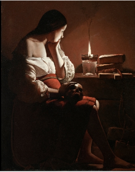 그림1) 바로크 시대 ‘왕의 화가’로 칭호를 받은 ‘조르주 드 라 투르(1593~1652)’가 그린 연작 ‘불꽃을 든 막달라 마리아'는 막달라 마리아가 무릎에 해골을 얹고 책상 위에 밝은 촛불을 켜고 있는 모습을 묘사하고 있다. 그녀는 촛불을 바라보며 턱 밑에 손을 괴고 있으며, 책상 위에는 다른 연작에서의 책과 마찬가지로 두 권의 책이 놓여 있다. 그중 하나는 성경이다. 책상 위에는 십자가와 밧줄이 있다. 밧줄은 막달라 마리아의 허리에 묶인 밧줄과 함께 삶과 죽음의 관계, 신과 인간의 관계를 상징하고 있다. 조르주 드 라 투르는 막달레나가 턱에 손을 괴고 앉아 다른 손으로 두개골을 어루만지며 죽음을 관조하는 모습을 그렸다.