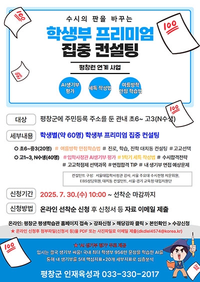 고등학생에게는 AI 생기부 평가, 세특 작성 및 피드백, 학생부·모의고사 상세분석, 면접 합격 전략 등 학생부 중심으로 집중 컨설팅을 진행한다.