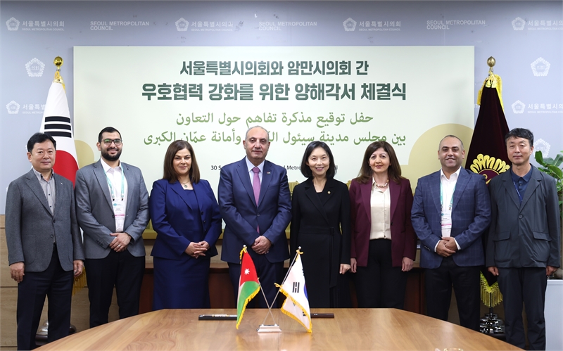 서울시의회는 30일(화) 최호정 의장과 유세프 알 샤와르베 암만 시장이 만나 우호협력 강화를 위한 MOU를 체결했다고 밝혔다.