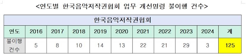 [더코리아저널 전영순 기자] 국회 문화체육관광위원회 이기헌 의원(더불어민주당, 경기 고양병)이 문화체육관광부로부터 받은 자료를 분석한 결과, 한국음악저작권협회(음저협)가 2016년부터 2024년까지 문체부의 업무 개선명령 총 411건 중 125건을 이행하지 않은 것으로 확인됐다.