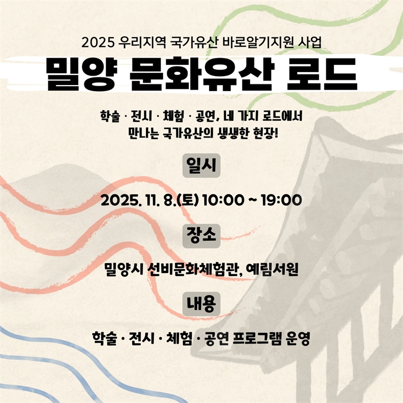 [더코리아저널 박현상 기자] 밀양문화관광재단(이사장 안병구, 이하 재단)은 오는 11월 8일 오전 10시부터 오후 7시까지 예림서원과 선비문화체험관 일원에서 지역 무형유산의 가치를 시민과 함께 나누는 ‘밀양 문화유산 로드’를 개최한다.