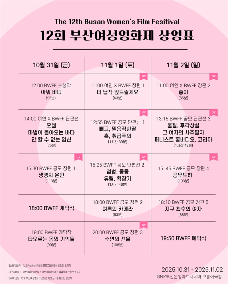 [더코리아저널 부산취재본부 강문주 기자] 12회 부산여성영화제가 10월 31일부터 11월 2일까지 3일간 남포동 BNK 아트시네마 모퉁이극장에서 열린다.