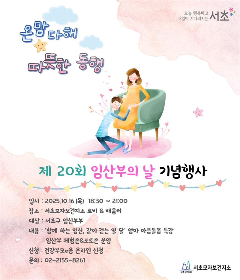 [더코리아저널 전영순 기자] 서초구(구청장 전성수)는 제20회 임산부의 날(10.10.)을 맞아 16일 오후 6시 30분부터 9시까지 서초보건지소에서 ‘온맘다해, 따뜻한 동행’을 주제로 기념행사를 개최한다고 밝혔다.