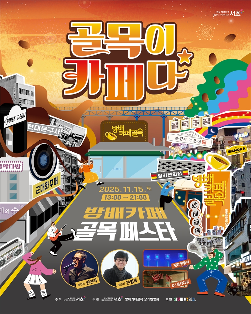 [더코리아저널 전영순 기자] 서초구(구청장 전성수)는 오는 15일(토) 방배카페골목 일대에서 7080의 낭만과 최신 트렌드를 함께 즐길 수 있는 ‘방배카페골목 페스타’를 개최한다고 밝혔다.