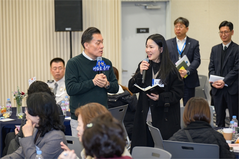 ‘2025 새빛만남- 수원, 마음을 듣다’에서 자주 볼 수 있는 풍경이다. 시민이 건의 사항을 이야기하면 담당 부서 책임자가 건의한 시민과 일정을 조율해 최대한 빨리 현장을 찾아 문제점을 확인하고, 개선 대책을 수립한다.